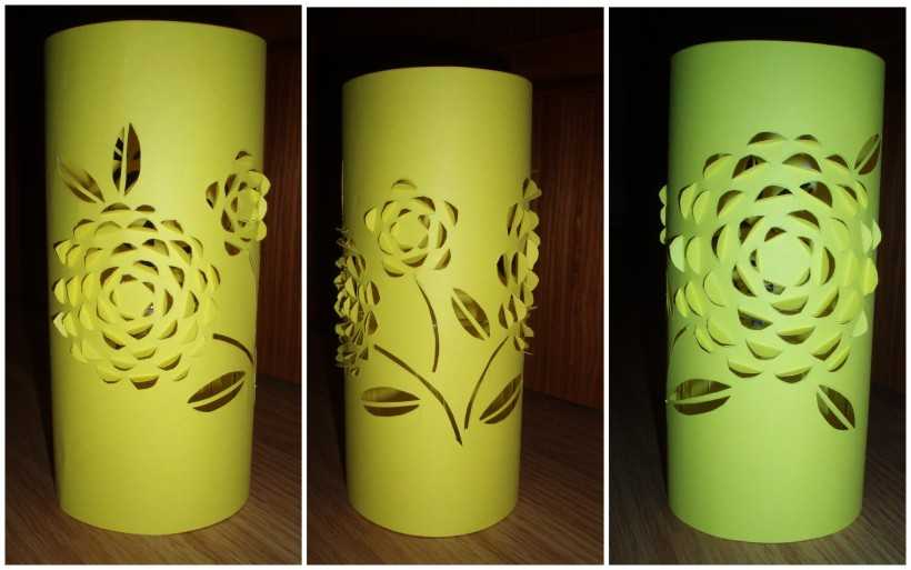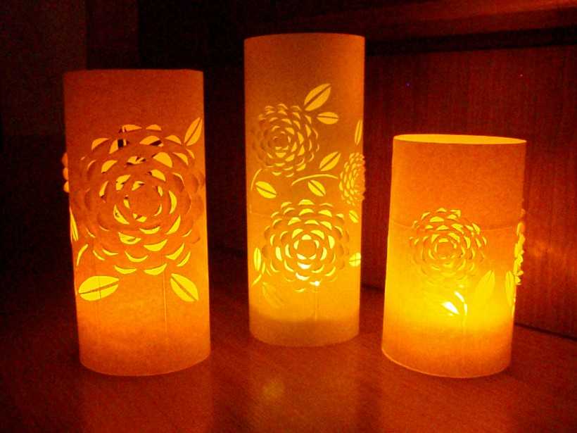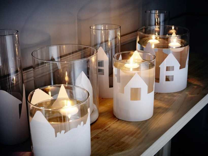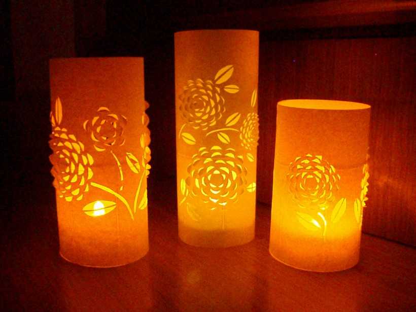 Разложить между трафаретами электрическую гирлянду и включить его. Свет от гирлянды будет выделять окошки, фонарики и силуэты. Волшебный город оживет! Поделка вполне может служить ночником.