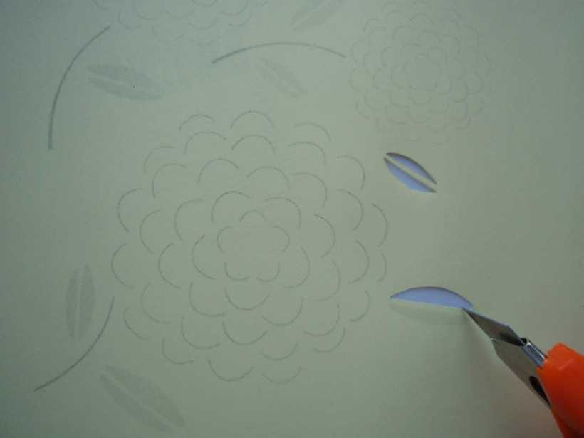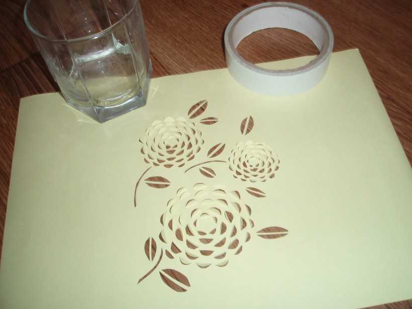 Берем лист, окрашенный в нежный голубой или розовый, почти белый цвет и повторяем процедуру. Меняем только рисунок и высоту листа (он должен быть выше предыдущего), но сохраняем стиль. Устанавливаем его так же вертикально за первым трафаретом.