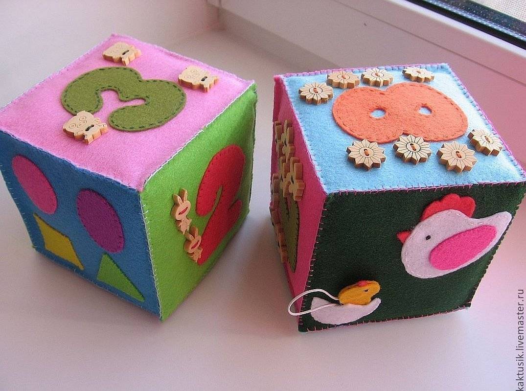 | Развивающие кубики | Если сделать кубики из фетра и наполнить их мягким материалом, не нужно будет беспокоиться о том, что малыш ударится, поранится или стукнет кого-то во время игры. Можно нашить на сторонах буквы, тогда их можно будет использовать при подготовке к чтению. |