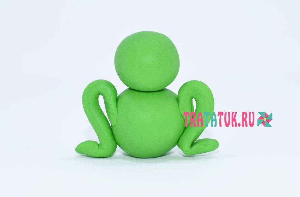 Соберите далее руки и ноги, приклейте к туловищу. Поскольку мы используем очень тонкие пластилиновые детали, то наш лягушонок будет сидеть, облокотившись на руки. Сформируйте нижнюю часть поделки.