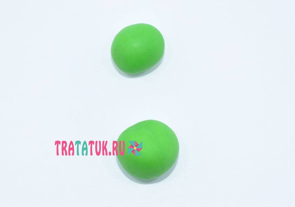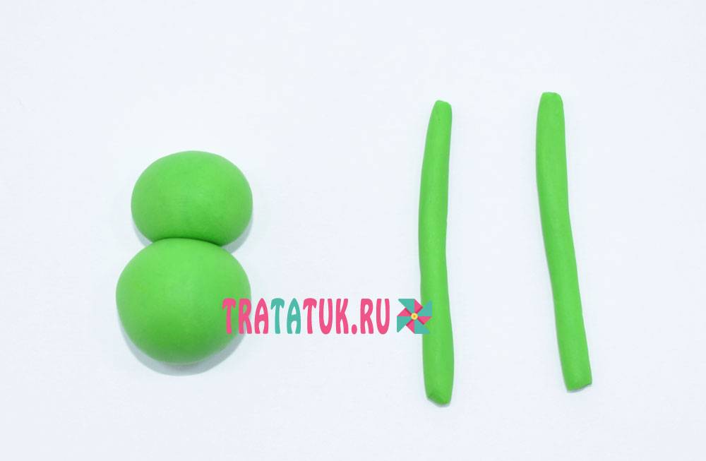 Скатайте из зеленого пластилина два шарика – один должен быть большего размера, для отличия туловища от головы.