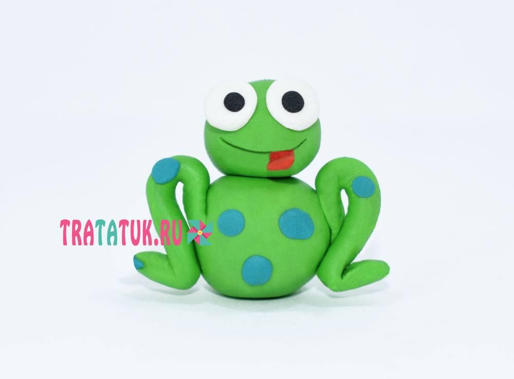 - Из зеленого пластилина другого оттенка скатайте мелкие шарики и приклейте на туловище и лапы земноводного.