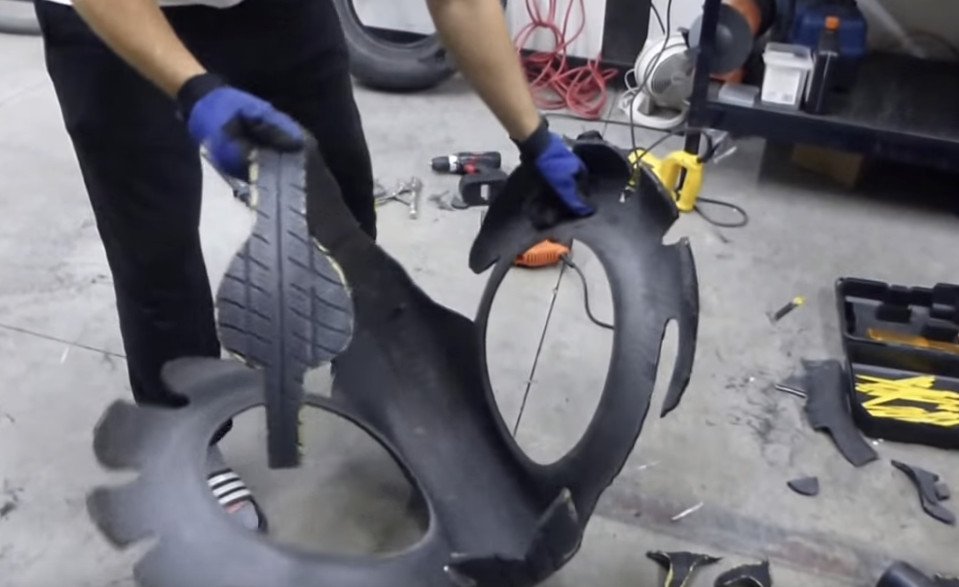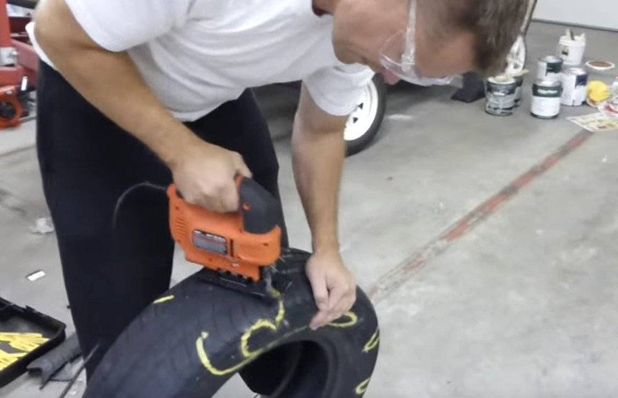 Выбор инструмента для этой задачи зависит от качества автопокрышки. Если она совсем изношенная, то может подойти и сапожный нож. Протектор потолще придется резать при помощи болгарки или электролобзика
