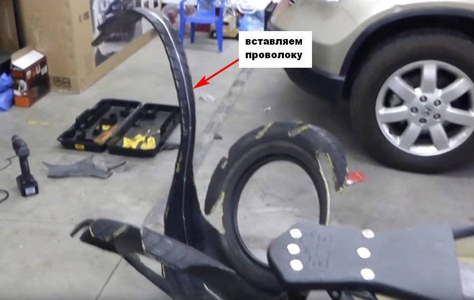 ❶ Приложив немного усилий, вывернуть шину наизнанку. В результате изделие обретет необходимый размах «крыльев». ❷ Укрепление шеи и головы лебедя: начиная от головы и до хвоста на расстоянии 15 см сделать парные отверстия (диаметр – около 3-х мм); из мягкой проволоки подготовить крепежные элементы – скобы; продеть скобы в отверстия; начиная с хвоста уложить металлический прут, закрепив его установленными скобами. ❸ Хвосту и шеи лебедя придать нужную форму, изогнув прут.