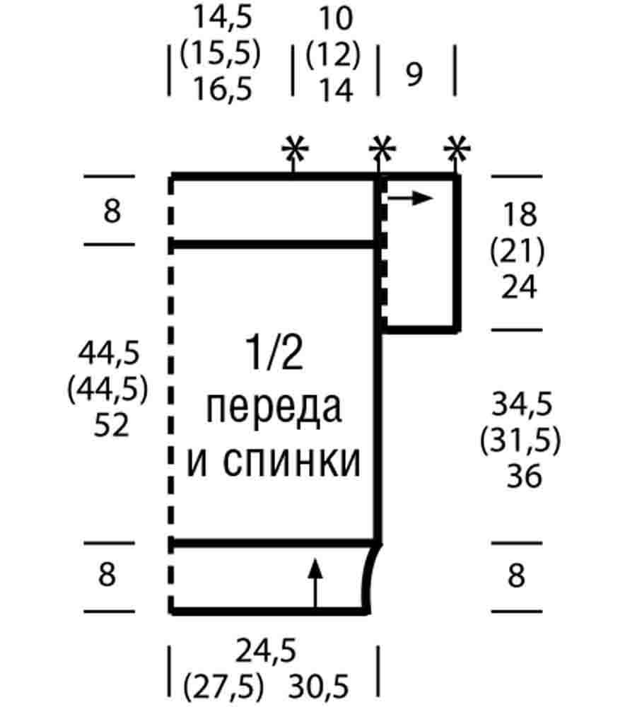 Остается 66,78,90п. В это же время на 38см (88р.) от резиночки закрываем для оформления горловины 24п. по центру и дальше каждую из половинок заканчиваем отдельно. Под закругление закрыв. по внутренней стороне в каждом четном р. 1р. по 3п., 3р. по 2п., 1р. по 1п. На размере, одинаковом со спинкой закрыв. по 11,17,23п. на каждом плече.