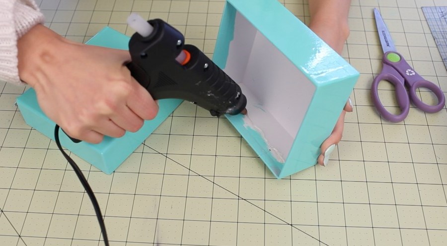 Необходимо продеть цепочку и закрепить ее на нужной длине. Чтобы удобно закрывать и открывать клатч необходимо прикрепить небольшой шнурочек в форме петельки, ко внутренней стороне коробки.