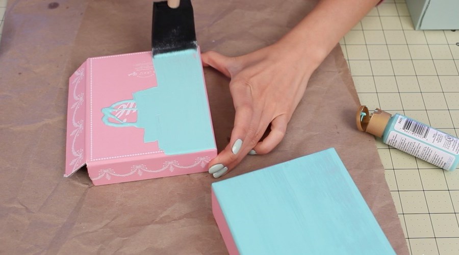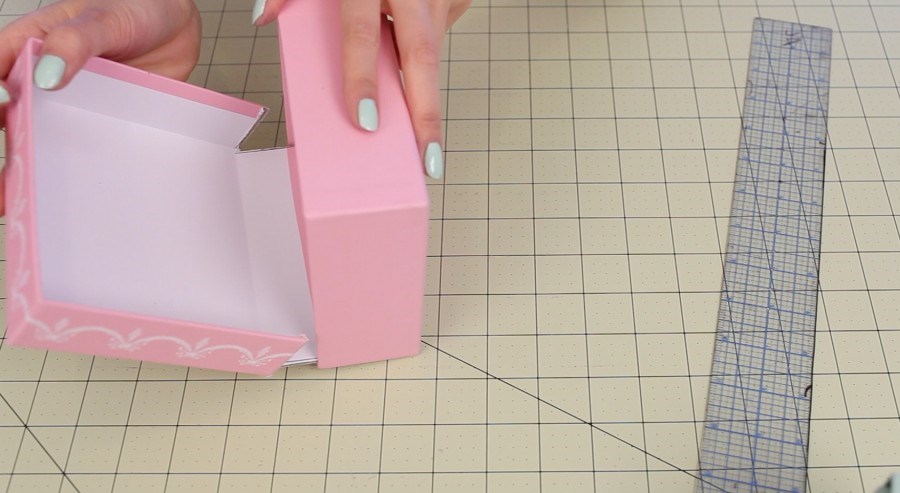 Приступим к выкройке одной из коробочек. Ее придется полностью раскрыть и отрезать верхнюю крышку. При этом должно получиться три прямоугольника, находящихся один над другим и два маленьких прямоугольника из боковинок коробочки.