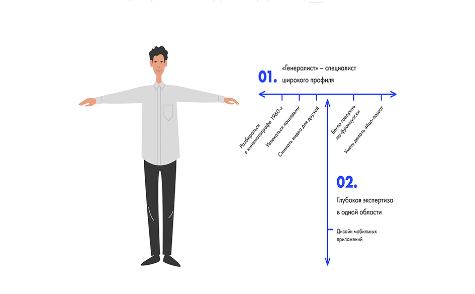 Модель T-shaped навыков можно представить, как человека с расправленными руками