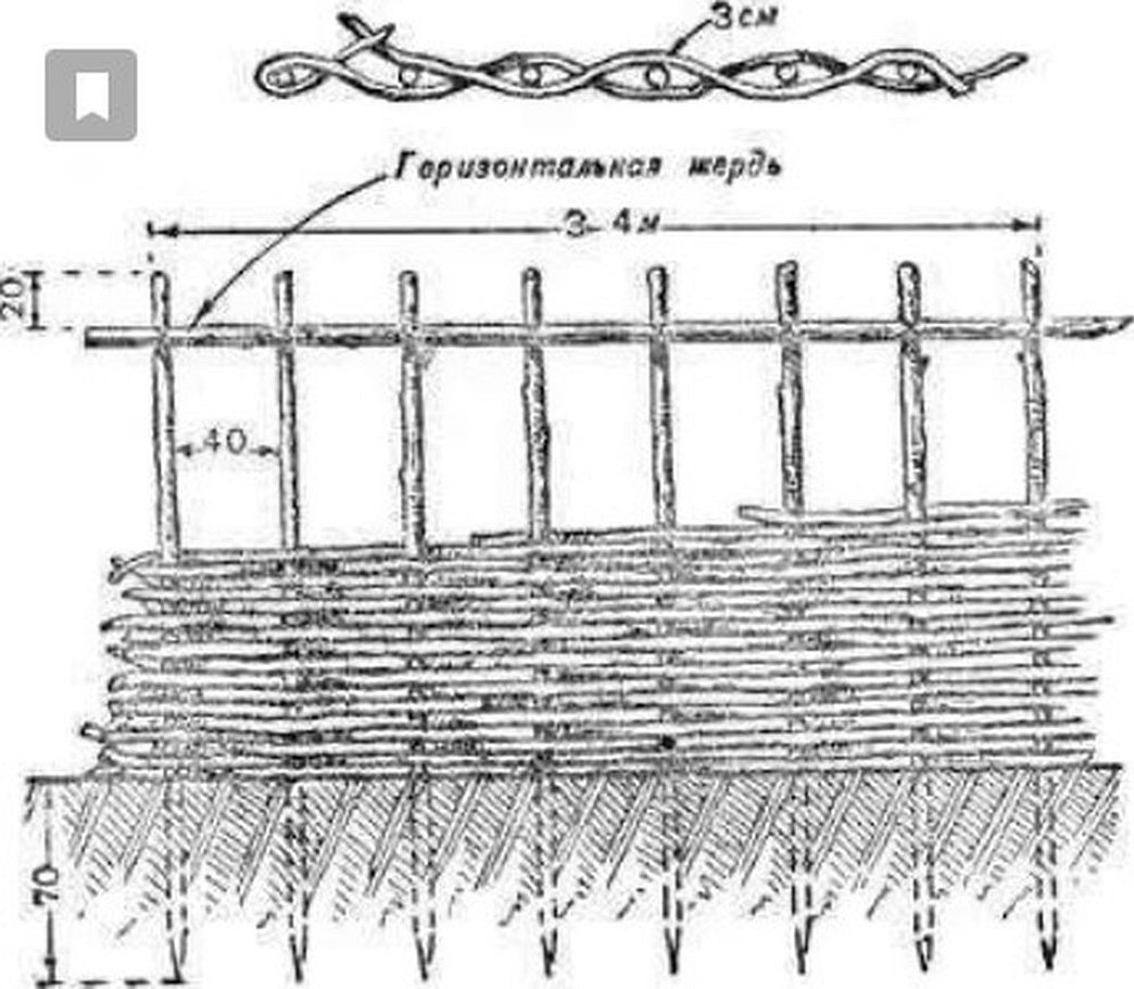 Перед укладкой ветви распаривают в горячей воде. Кора снимается. Но можно выполнять плетение ивовой лозой, которую только что срезали. Под столбы готовят прочные ветки диаметром 4-8 см. Их длина должна превышать высоту ограды примерно на треть. Порода дерева для опор: лиственница, сосна.