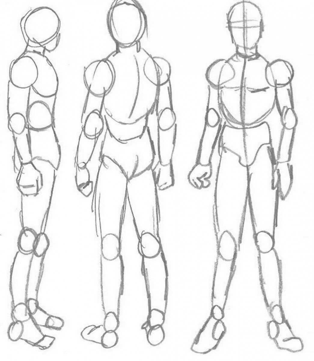 Позвоночник — основа всей фигуры, его можно наметить изогнутой линией. Крупные суставы плеч и таза схематично изображаются кружочками. Линии эскиза проводятся легко, без нажима.