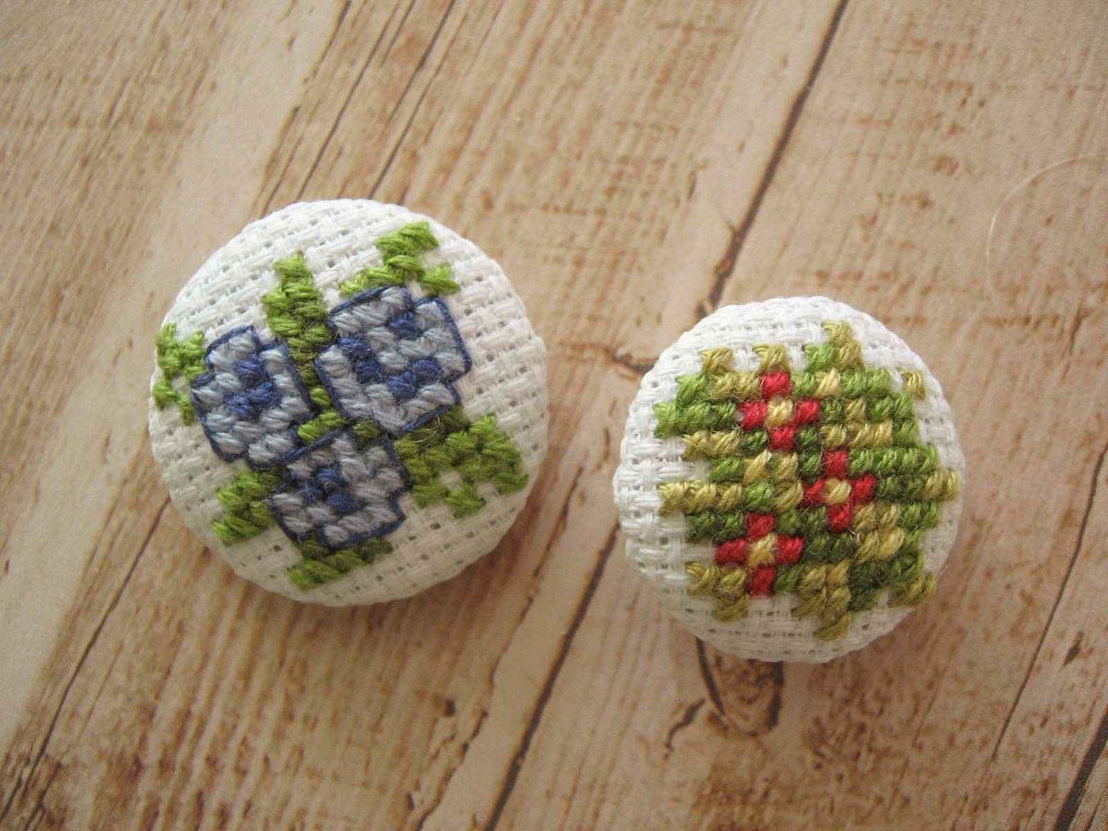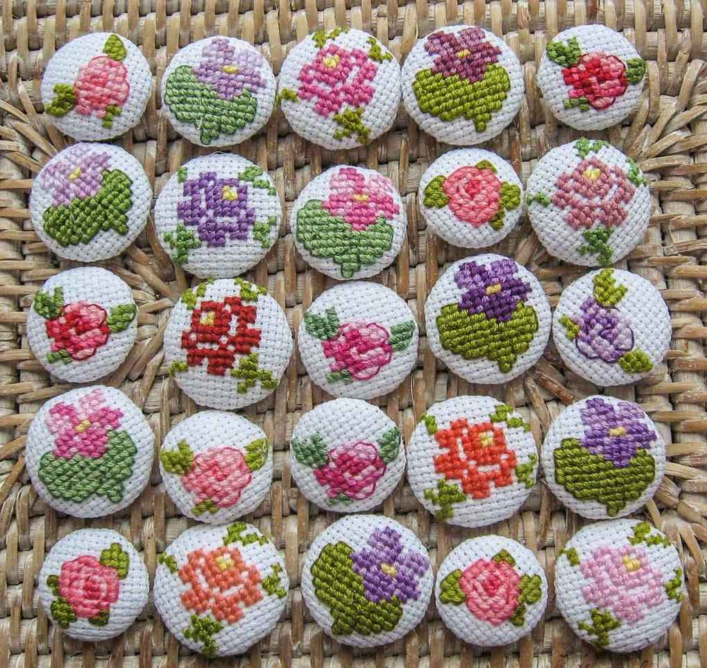 Вышивальщицам нет необходимости объяснять технику вышивания. Изготовление изделия просто. На небольшом лоскуточке вышивают узор. Вырезают круг размером больше пуговицы, на которую натягивают лоскуток. Прошивают по краям крупными стежками, и после натягивания на пуговицу затягивают нить, собирая края.