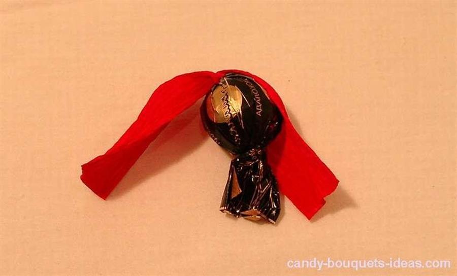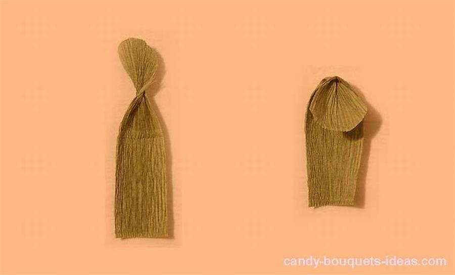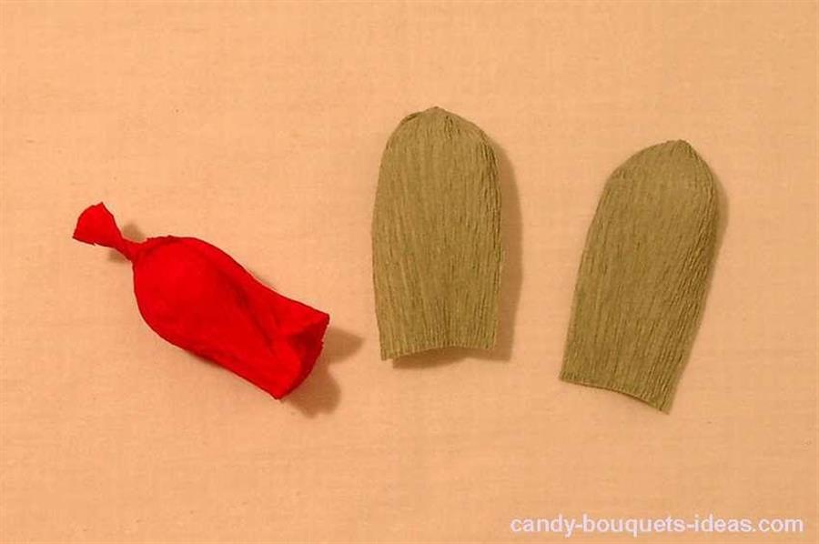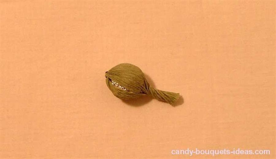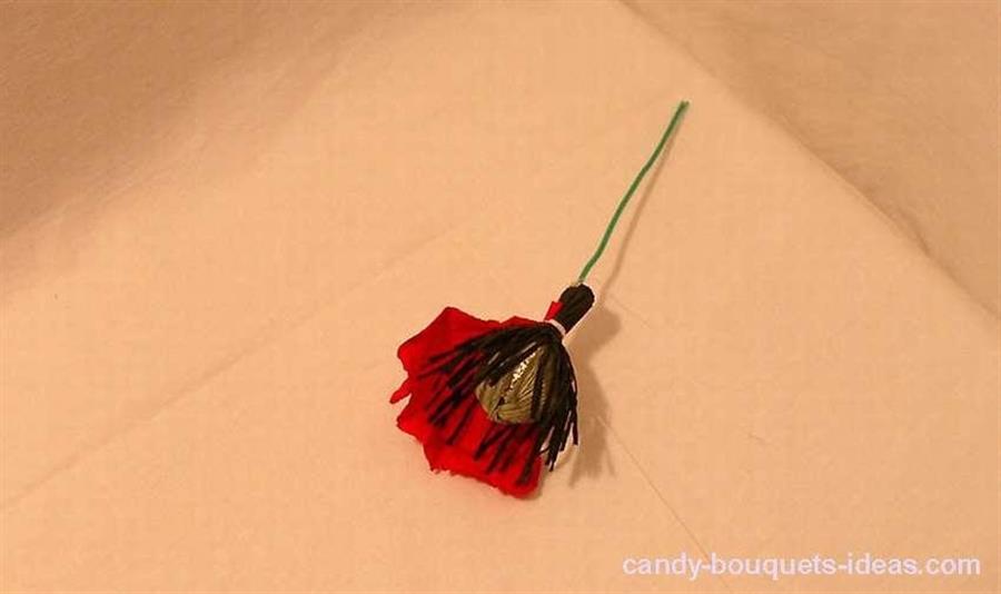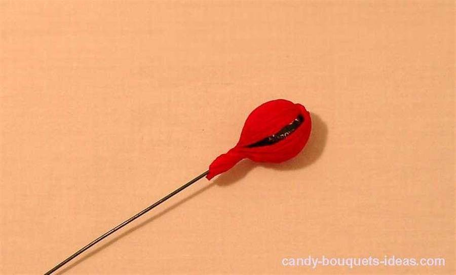 Расправив лепестки, вкладываем в один из них конфету, накрываем другим и скручиваем концы. Получаем не до конца раскрывшийся маковый бутон.