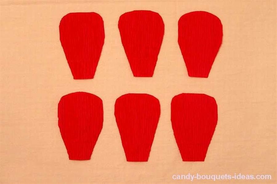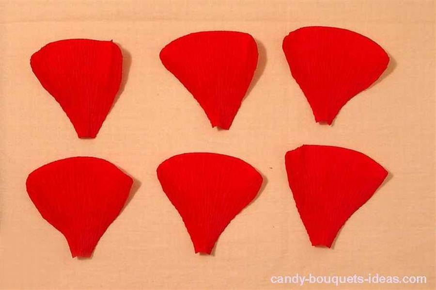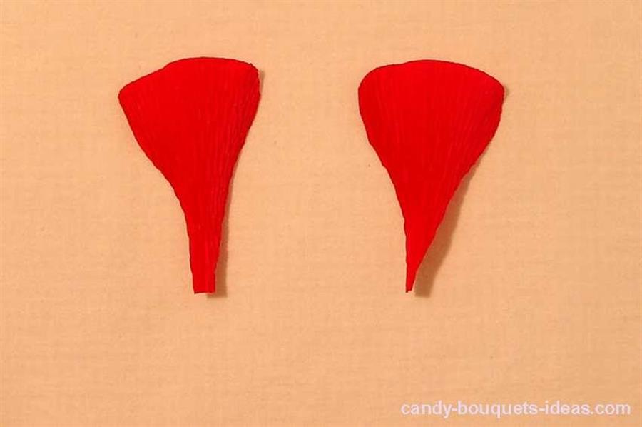 Из красных прямоугольников вырезаем лепестки каплевидной формы, но с обрезанным острым кончиком.