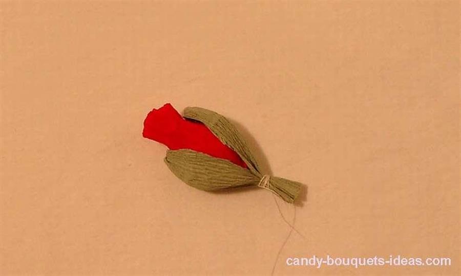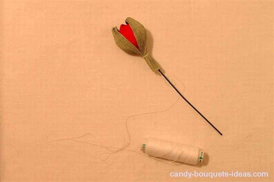 К основанию бутона приматываем листья, тщательно перетягивая ниткой.