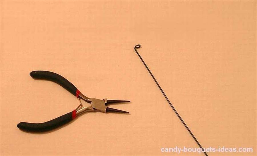 Для этого заворачиваем конец проволоки или флористического провода в петельку, сгибаем её на 90 градусов и горячим клеем прикрепляем к основанию цветка.