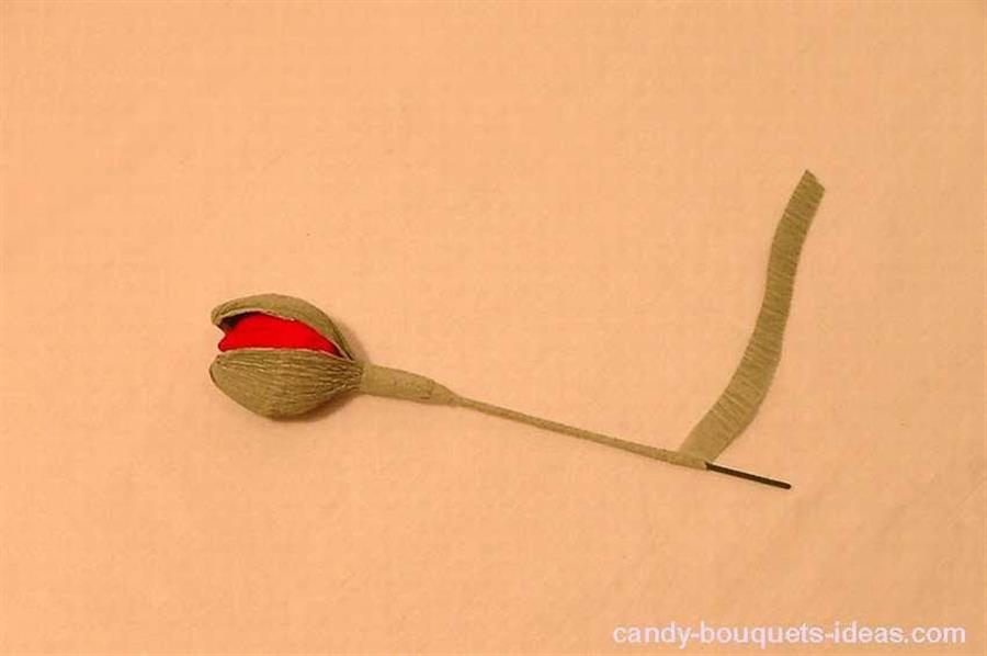 Перематываем весь стебель полоской зелёной гофрированной бумаги – и готово! Необычно, не правда ли?