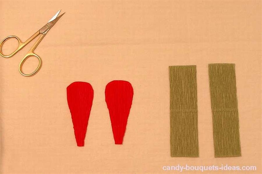 Всё просто: из красных прямоугольников мы снова вырезаем каплевидные лепестки, а у зелёных округляем верхушку.