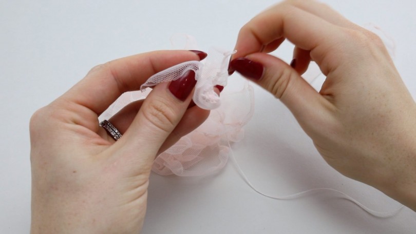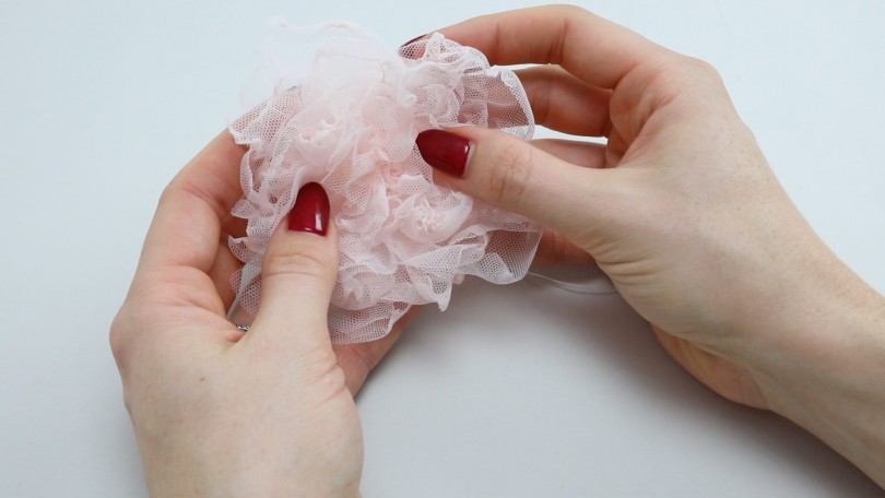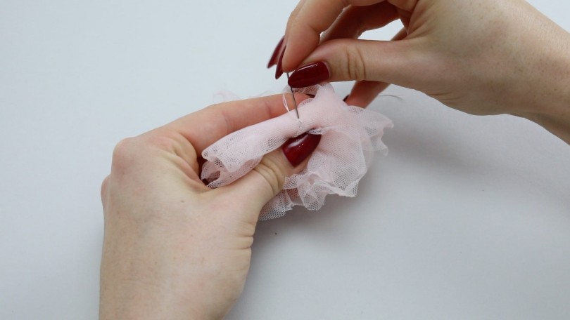 Подготовленный ручной шов теперь необходимо сильно стянуть, собирая ткань ленты в равномерные складки.