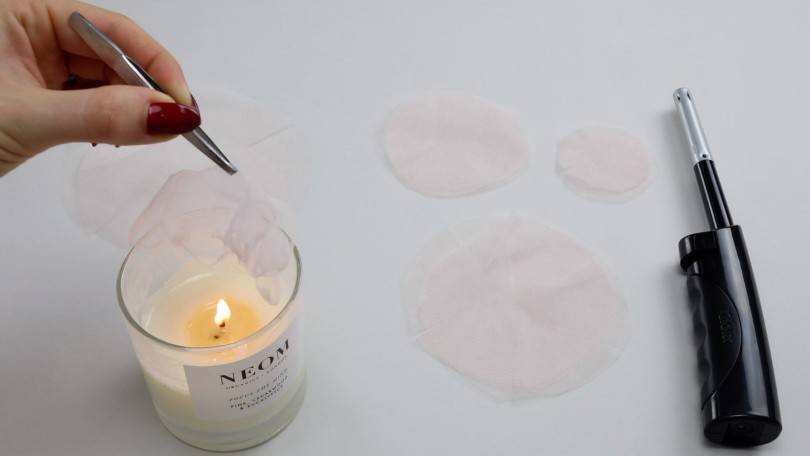 Оплавляем края лепестков. Если вы ранее никогда не делали подобной операции – потренируйтесь на ненужном лоскуте. Оценив, как быстро оплавляется ткань, как близко к пламени нужно подносить край ткани, вы сможете аккуратно обработать края лепестков.