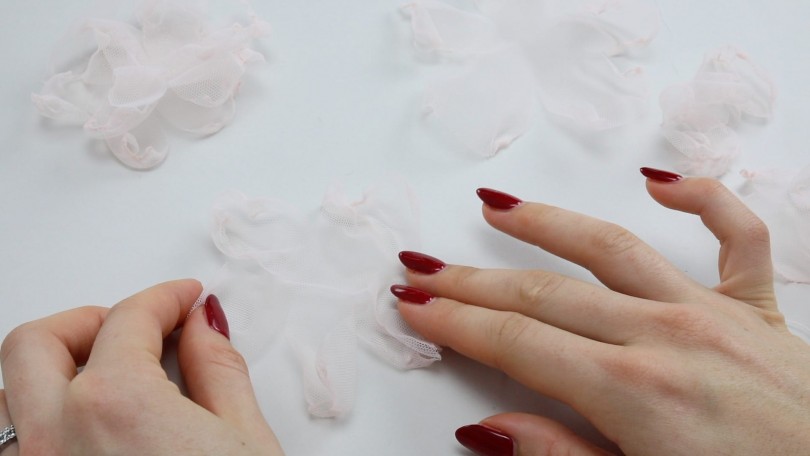 Небольшое количество клея необходимо нанести на заднюю часть изнутри каждой заготовки, затем склеить. Лепестки у основания нужно нанизывать на нить, сшивая их.