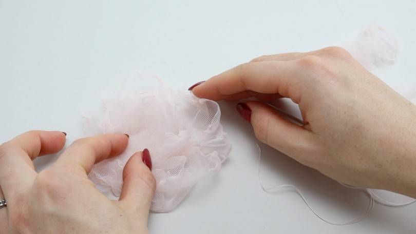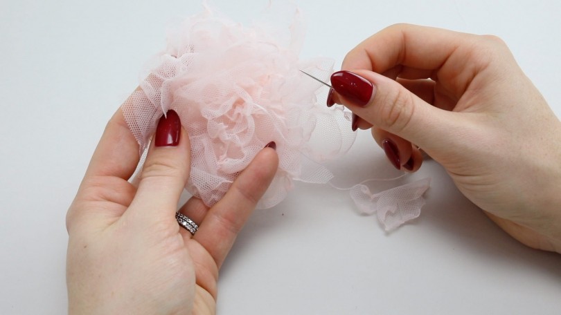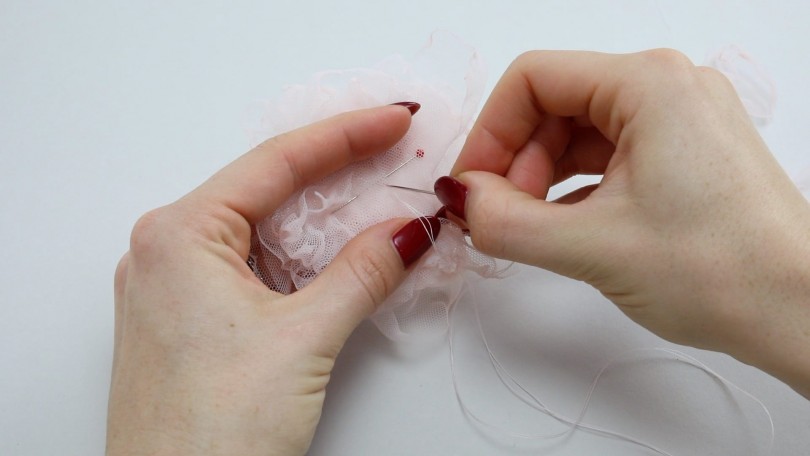 - Как только край сшит, попробуйте немного стянуть его: на глазах цветок начинает формироваться сам.