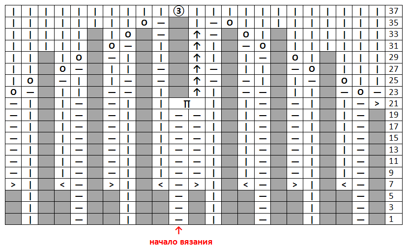 - Получаем узор: 1 кромочная п, 4 лиц. п, 23 изн. п, 8 лиц. п, 23 изн. п, 4 лиц, 1 кромочная