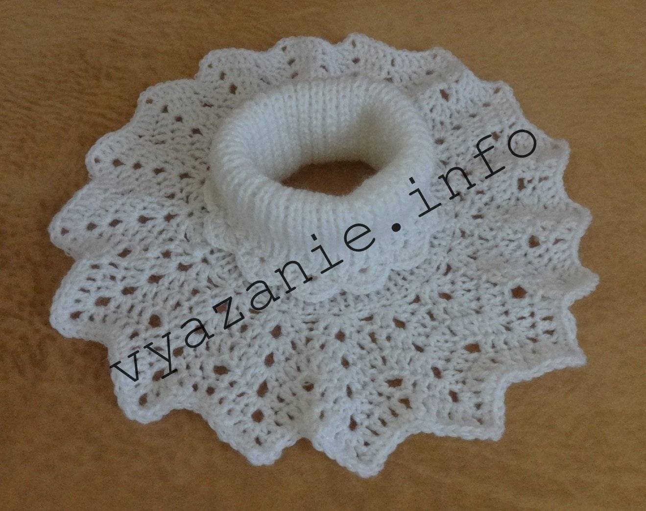Эта манишка вяжется очень просто. Сначала набираем столько петель, сколько нужно для шапки (чтобы голова хорошо проходила). Вяжем по кругу резинкой 1 лицевая, 1 изнаночная. Закрываем петли после того, когда связали нужную длину ворота. Затем берем крючок такого же размера, как спицы или поменьше и вяжем крючком. На верхнем фото ворот связан спицами №5, обвязывала крючком №4. На следующем фото спицы №5, крючок №6. Последний ряд можно связать столбиками без накида, в цепочку из воздушных петель вяжем 4-5 столбиков.