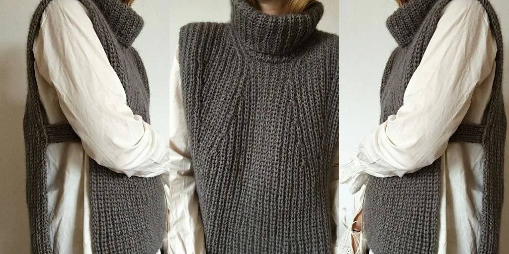 Изделие вяжется сверху вниз на двух прямых спицах с вывязыванием планки. Горловина не складывается пополам, а вяжется на высоту шей.