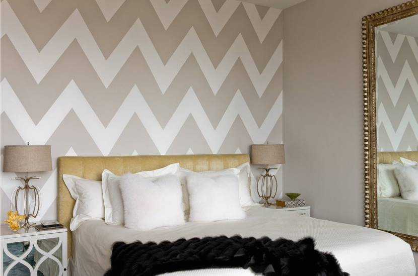- Шеврон. Модный принт, также известный под названием «ёлочка». Активно используется с середины прошлого века. Если интерьер выдержан в нейтральной цветовой палитре, шеврон может послужить для создания акцентной стены.