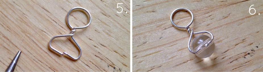 Теперь с помощью круглогубцев загните края проволоки во внутрь. Берем подходящую бусину и оттянув один край полученного проволочного маркера надеваем бусину, и обратно в ее отверстие вставляем конец проволоки. Конца проволоки прижимаем по краям к бусине.