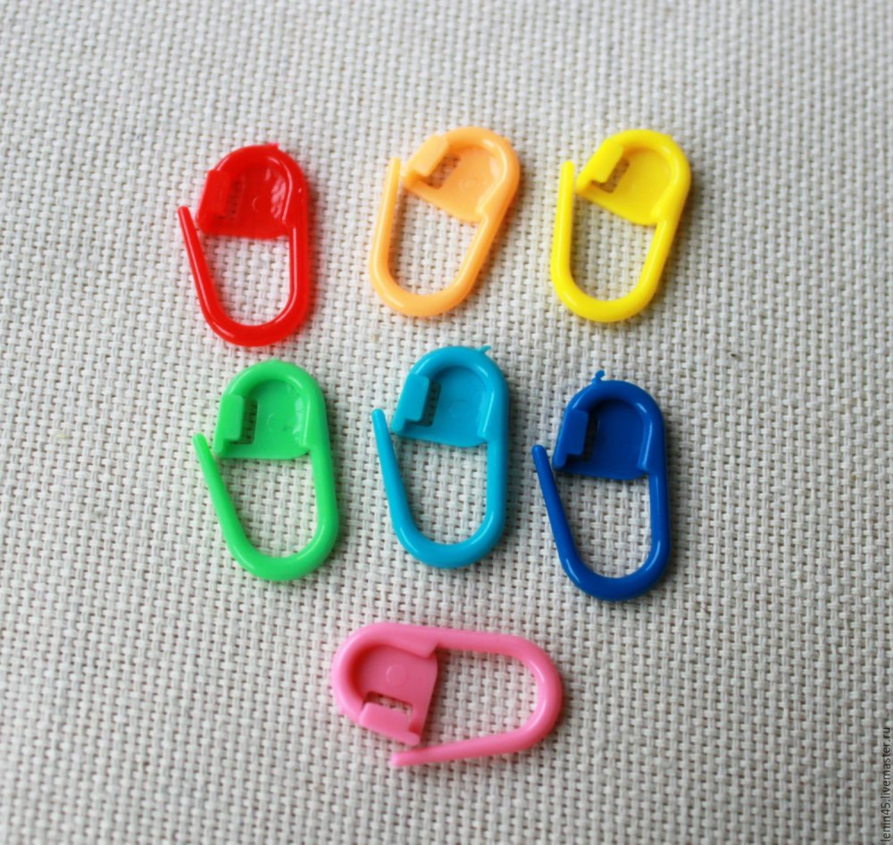 В качестве разъёмного запирающегося маркера можно использовать и обычные металлические английские булавки, булавки для белья, кольца для ключей, карабины и крупные застёжки для бижутерии. Чаще всего определить удобство того или иного приспособления получается в процессе работы с определёнными нитками и инструментами.