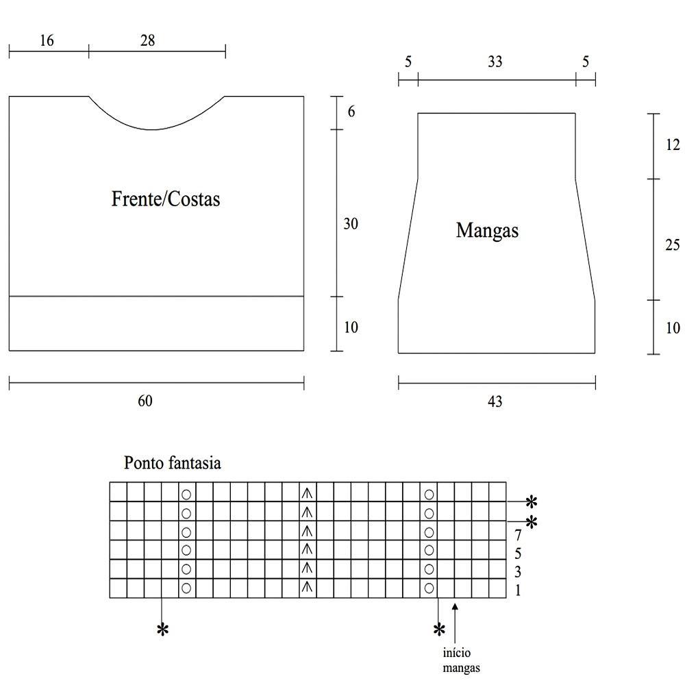 Набир. из мохера 46;54;62п. и выполняем узорчик, пользуясь схемами. На 42;44;46см набир. на каждой стороне по 16п. для рукачиков. У нас 78;86;94п. Включаем их в общий рисунок и продолжаем ровным полотном. На 70;74;78п. закрыв. 8п. по центру для формирования горловины. На каждое плечо остается 35;39;43п. На 72;76;80см закрыв. п. с л. стороны.