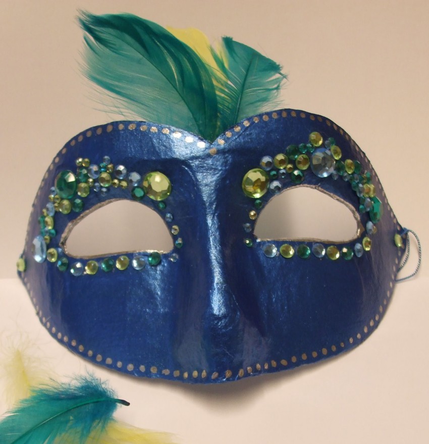 - Макать бумагу в клейкий раствор и обклеивать слоями основу маски. Чтоб маска была более прочной, армированной нужно нанести 7-8 слоев. Дать маске хорошо высохнуть, покрыть гуашью или другой краской, украсить и сделать завязку из резинки, тесьмы. Такой способ пожалуй самый простой. Но если, хочется создать более ценный шедевр, то шаблон маски стоит делать не из бумаги или картона, а из: фольги, пенопласта, слепить из пластилина или творческой глины. Именно из этих материалов атрибут будет выглядеть более объёмная, уникальнее, эффектнее. Также мелкие детали можно декорировать пластилином, бусинками, перьями.