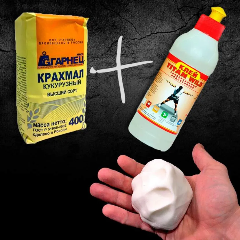 Крахмал смешивают с содой, всыпают в кастрюлю и ставят на огонь. Доливают немного воды и при постоянном помешивании доводят до образования шара, при необходимости воду можно доливать. Когда масса остынет, ее тщательно вымешивают.