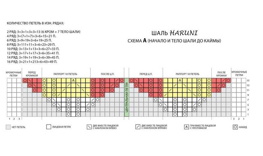 Фото, описание и схемы шали «Харуни», спицами которую связать не очень сложно, представлены ниже. На схеме наглядно представлен основной узор. Стоит отметить, что это только одна половина шали. После провязывания петель по схеме идет центральная петля, а затем узор повторяют на второй половине в зеркальном отображении. По обеим сторонам будут располагаться три кромочные петли, которые на схеме не указаны. Вяжутся они платочной вязкой – по лицу и изнанке лицевые.