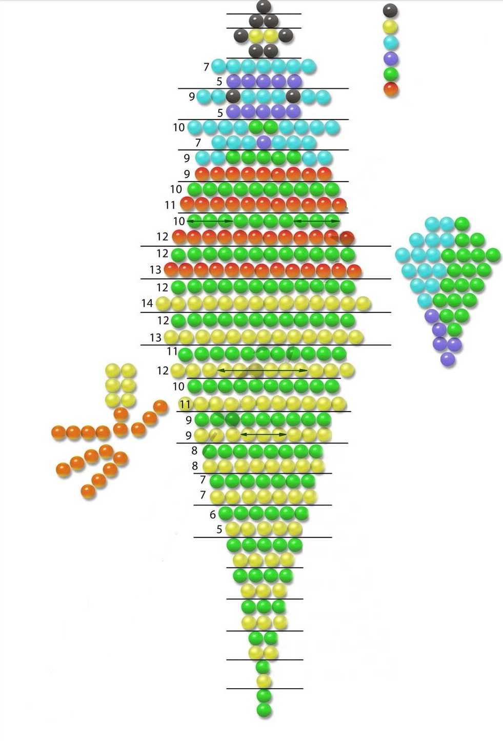 Для создания крыльев из бисера, вам понадобится добавочные отрезки, длина которых варьируется в районе тридцати – тридцати пяти сантиметров. На меньшем отрезке данные детали могут не получиться, поэтому лучше взять с запасом. Они вставляются в 3 заключительные бусины в определенном ряду, согласно схемы. Кроме того, их следует фиксировать по ходу плетения в ряду, который плотно не стянут. Это даст возможно сделать крылышки более ровными. Обе детали идентичны одна другой. Сделав их, концы зафиксируйте среди протяжек.