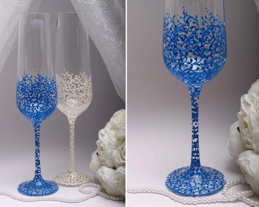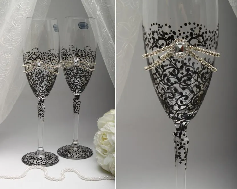 Варианты оформления свадебных бокалов вручную