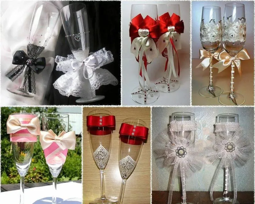 Наиболее бюджетными и простыми материалами являются атласные и репсовые ленты. При этом внешний вид изделия остается на достойном уровне, а оформление бокалов на свадьбу превращается в достаточно интересный и приятный процесс, который только еще больше сближает пару. Здесь нет ограничений, поэтому невеста может воплотить все свои творческие идеи.