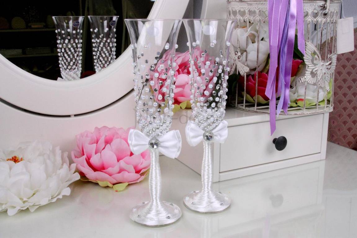 Очень дорого и изысканно смотрятся свадебные бокалы, украшенные бусинами, стразами и жемчужинами. Такой метод декупажа требует больших усилий и времени, поскольку необходимо равномерно зафиксировать жемчужины на стеклянной поверхности. При желании можно с их помощью создать настоящие рисунки. Такие украшения будут обеспечивать дополнительный блеск, и любой напиток в таких сосудах будет смотреться роскошно.