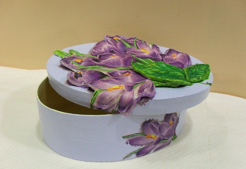 - Бумагу с мотивом замачивают в воде, на обратную сторону наносят клей, а также на готовую поверхность изделия. Рисунок накладывают изображением вниз. Сюжет клеят от середины, двигаясь в стороны, вытесняя воздушные пузыри.