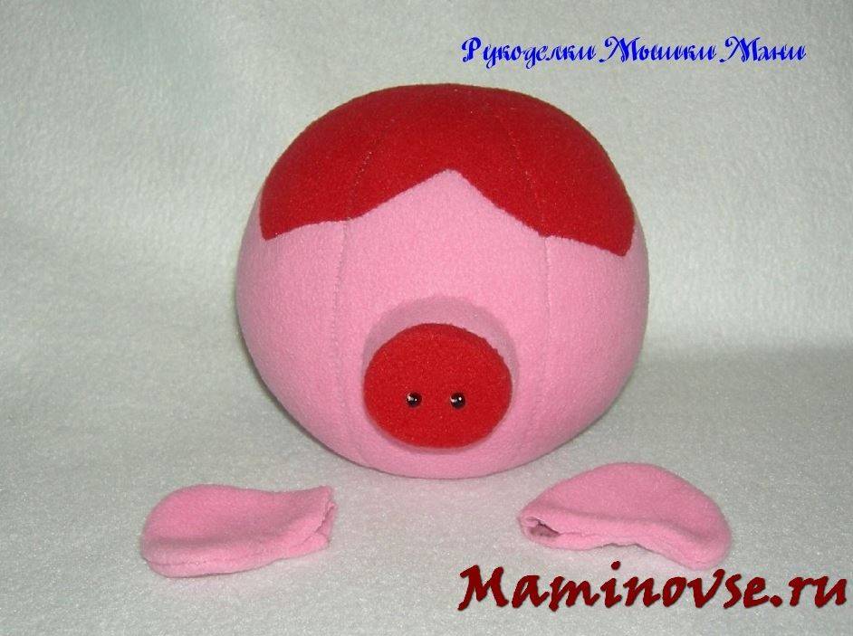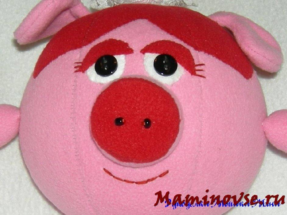 Пришиваем пятачок на место, вышиваем ноздри (можно вместо вышивки пришить две бусинки чёрного цвета). Стачиваем части ушей и выворачиваем их.