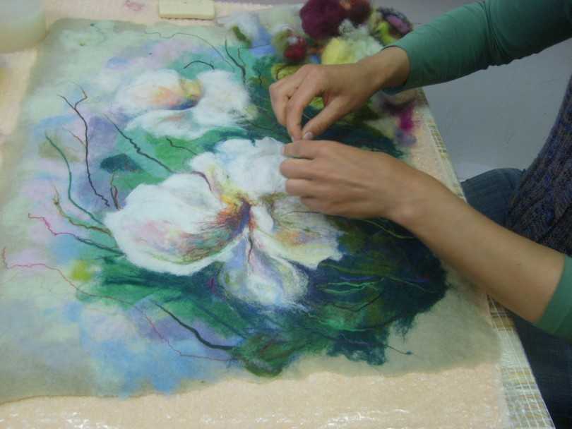 - Просушите полотно при помощи махрового полотенца и оставьте на несколько минут. В процессе оно немного сядет. Такое валяние из шерсти поможет создавать картины как начинающим взрослым художникам, так и детям.