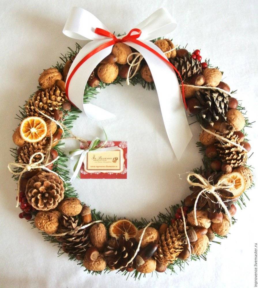 орехами, рябиной и большим бантом, который скроет крючок и придаст завершённый вид изделию. Также можно использовать зелёную мишуру, которая заменит натуральные веточки и оттенит своим цветом всю композицию.