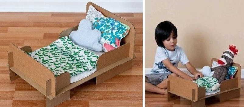 Наверняка, дома у вас найдется картонная коробка из под обуви или упаковка из под электроприбора. Из нее можно смастерить замечательную кроватку для куклы.