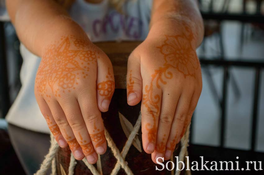 Говорят, что мехенди держится до трех недель. У Аринки, которая каждый день много купалась в море и возилась в песке, рисунок продержался около недели. Если хотите приехать из Индии с красивыми узорами на теле, делайте менди буквально в последний день отпуска.