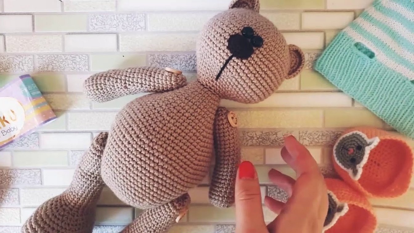 Нитку оборвать, зафиксировать и спрятать. Вторую руку-лапу связать точно так же.