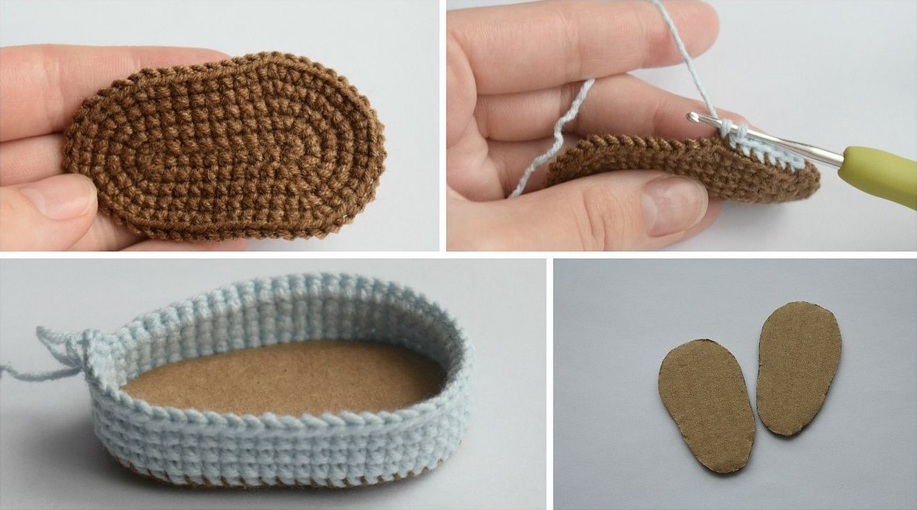 Стопы медвежонка выполняют по принципу подошвы пинеток. Сначала вяжут по приведенной схеме, а далее так: