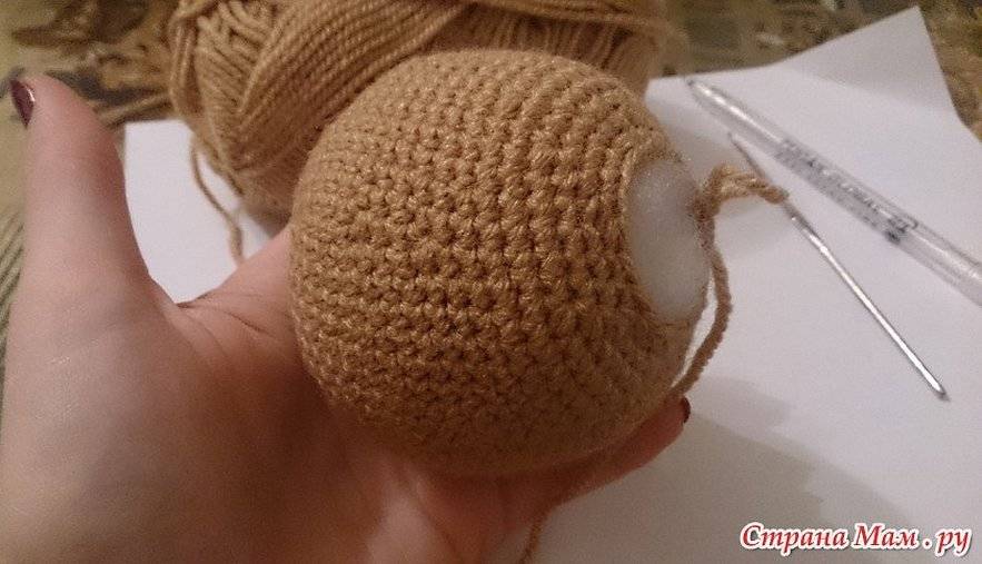 Эти части тела у медведя набивать не нужно, но чтобы они хорошо держали форму, их вяжут в 2 нити.