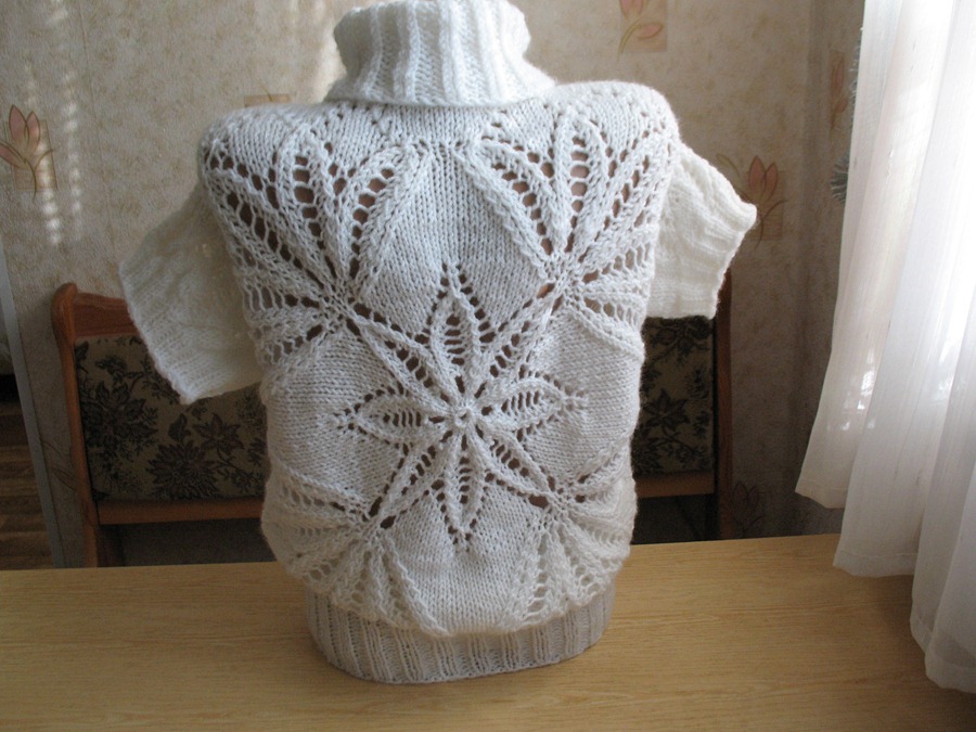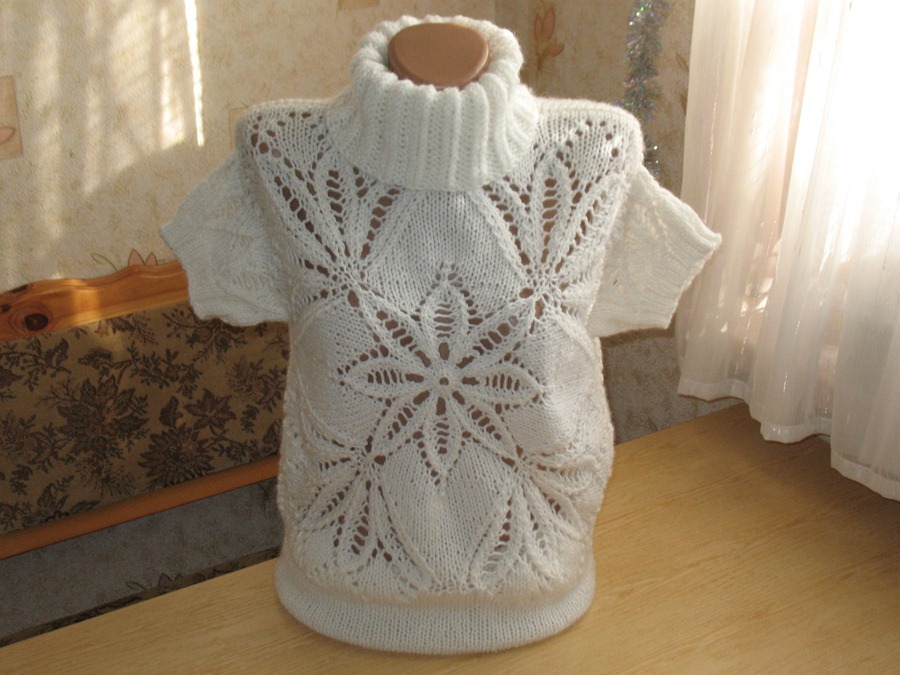 Очень долго я хотела связать такой пуловер. Достаточно долго разбирала схему и, наконец, связала. По-моему личному мнению получился очень красивый,очень зимний и достаточно стильный пуловер с коротким рукавом (носить под водолазку).