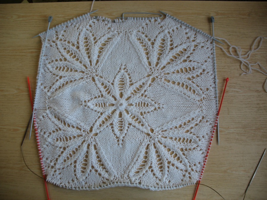 У вас должен получится квадрат. Отделите на дополнительные спицы петли для рукавов, боковых частей, низа. Свяжите вторую часть (допустим переднюю, с большим вырезом горловины) сшейте петля в петлю боковые и плечевые части.